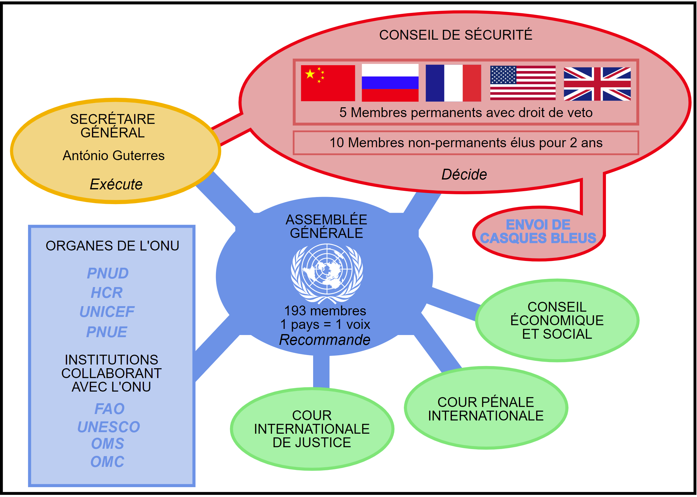 Mais il y a aussi le conseil de sécurité qu’il ne faut pas oublier. Le Conseil de sécurité a la responsabilité principale du maintien de la paix et de la sécurité internationale. C’est l’organe « exécutif » de l’ONU donc comme dans toute organisation, elle a une influence qui va au-delà de l’assemblée générale.